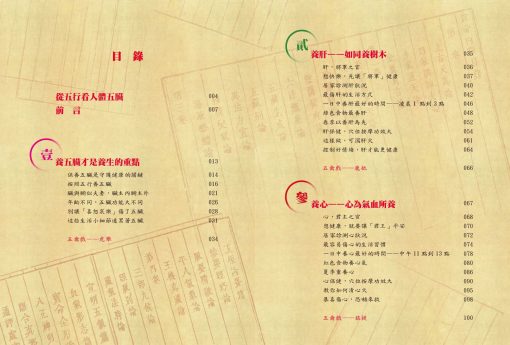 貳 養肝——如同養樹木 肝,將軍之官 想快樂,先讓「將軍」健康 居家診測肝狀況 最傷肝的生活方式 一日中養肝最好的時間——凌晨1點到3點 綠色食物最養肝 春季以養肝為先 肝保健,穴位按摩功效大 這樣做,可瀉肝火 控制好情緒,肝才能更健康 五禽戲——鹿抵
