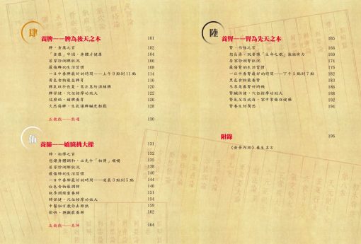 伍 養肺——嬌臟挑大樑 肺,相傅之官 想讓身體調和,必先令「相傅」順暢 居家診測肺狀況 最傷肺的生活習慣 一日中養肺最好的時間——凌晨3點到5點 白色食物最潤肺 秋季潤燥重養肺 肺保健,穴位按摩功效大 中醫秘方教你去肺熱 愉快、樂觀最養肺 五禽戲——鳥伸